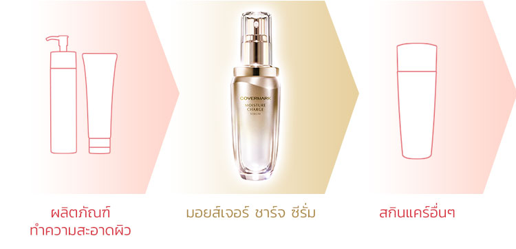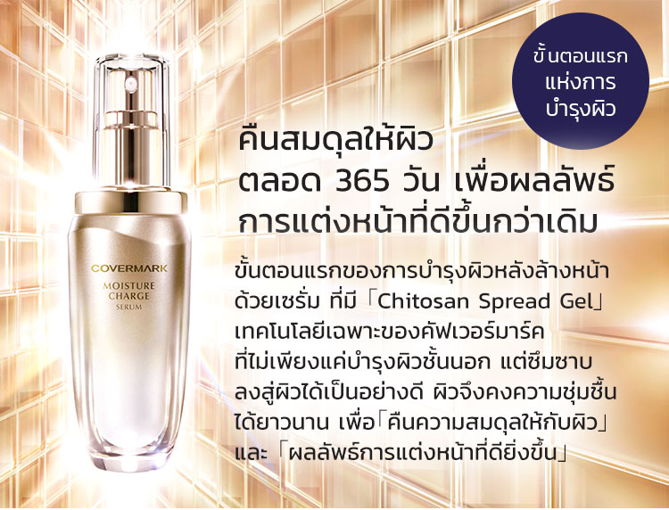 ขั้นตอนแรกของการบำรุงผิวหลังล้างหน้า ด้วยเซรั่ม ที่มี 「Chitosan Spread Gel」 เทคโนโลยีเฉพาะของคัฟเวอร์มาร์ค ที่ไม่เพียงแค่บำรุงผิวชั้นนอก แต่ซึมซาบ ลงสู่ผิวได้เป็นอย่างดี ผิวจึงคงความชุ่มชื้น ได้ยาวนาน เพื่อ「คืนความสมดุลให้กับผิว」 และ 「ผลลัพธ์การแต่งหน้าที่ดียิ่งขึ้น」